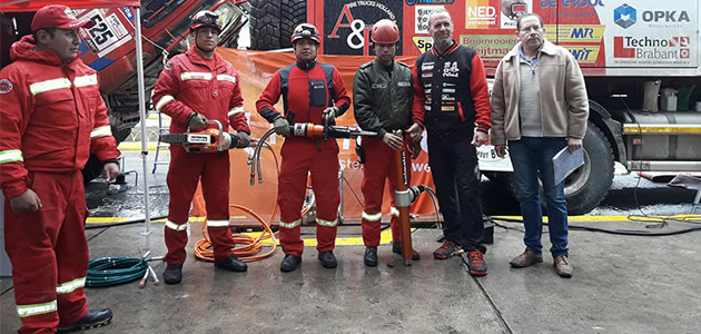 On behalf of Firefighers Without Borders, the Dutch “Firemen Dakarteam” donate a set of Holmatro rescue equipment to a local fire service in La Paz, where they have a stopover during the 2018 Dakar Rally.