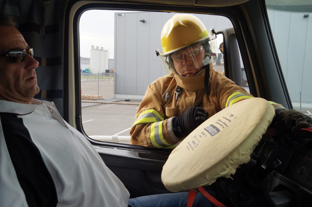 Airbag protection cover for application in cars, vans, buses and trucks: One size fits all. To neutralize the impact of an accidental airbag explosion after a road traffic collision.