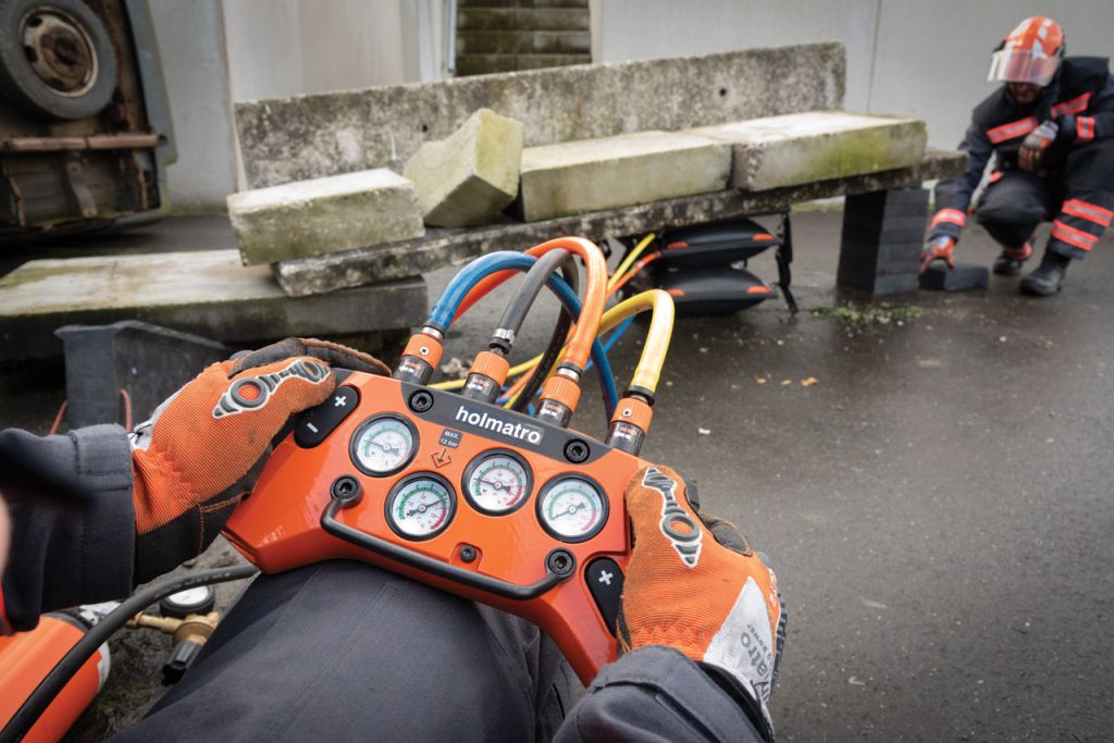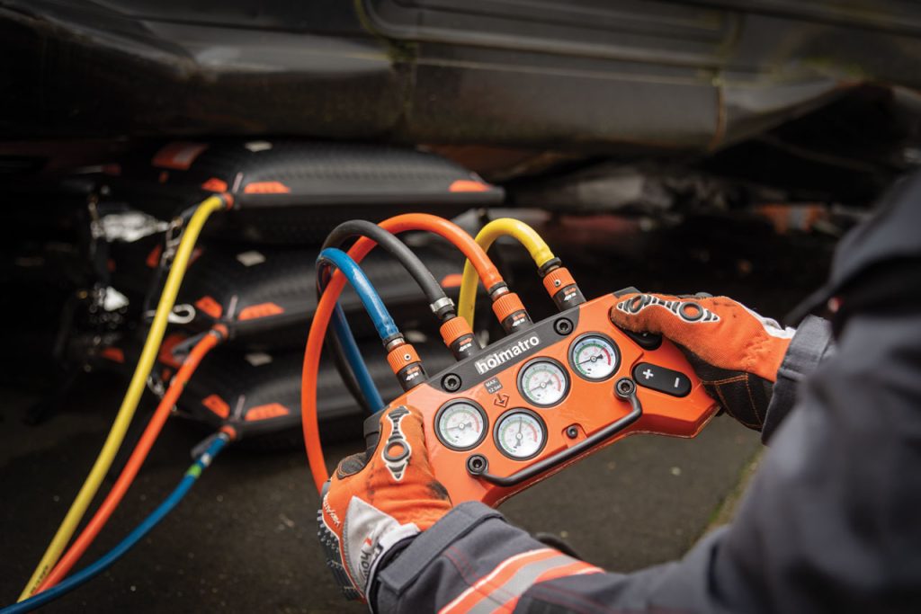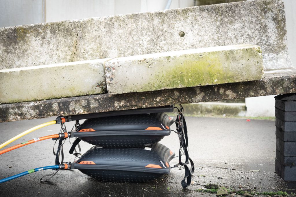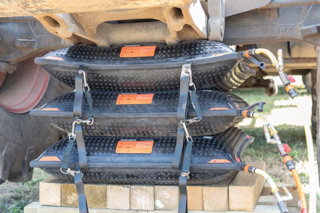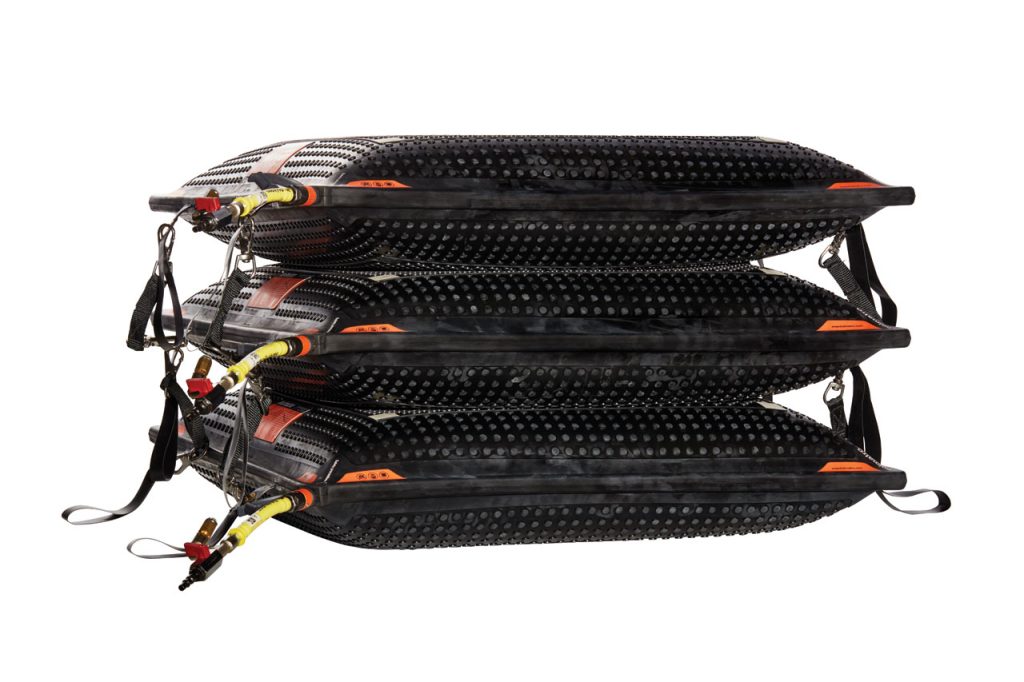 High-pressure lifting bag, 12 bar / 174 psi system, part of the Holmatro Stack Bags Series. The contact surface of the Stack Bag remains flat when pressurized. Up to three Stack Bags can be stacked for safe and stable lifting over a greater height.